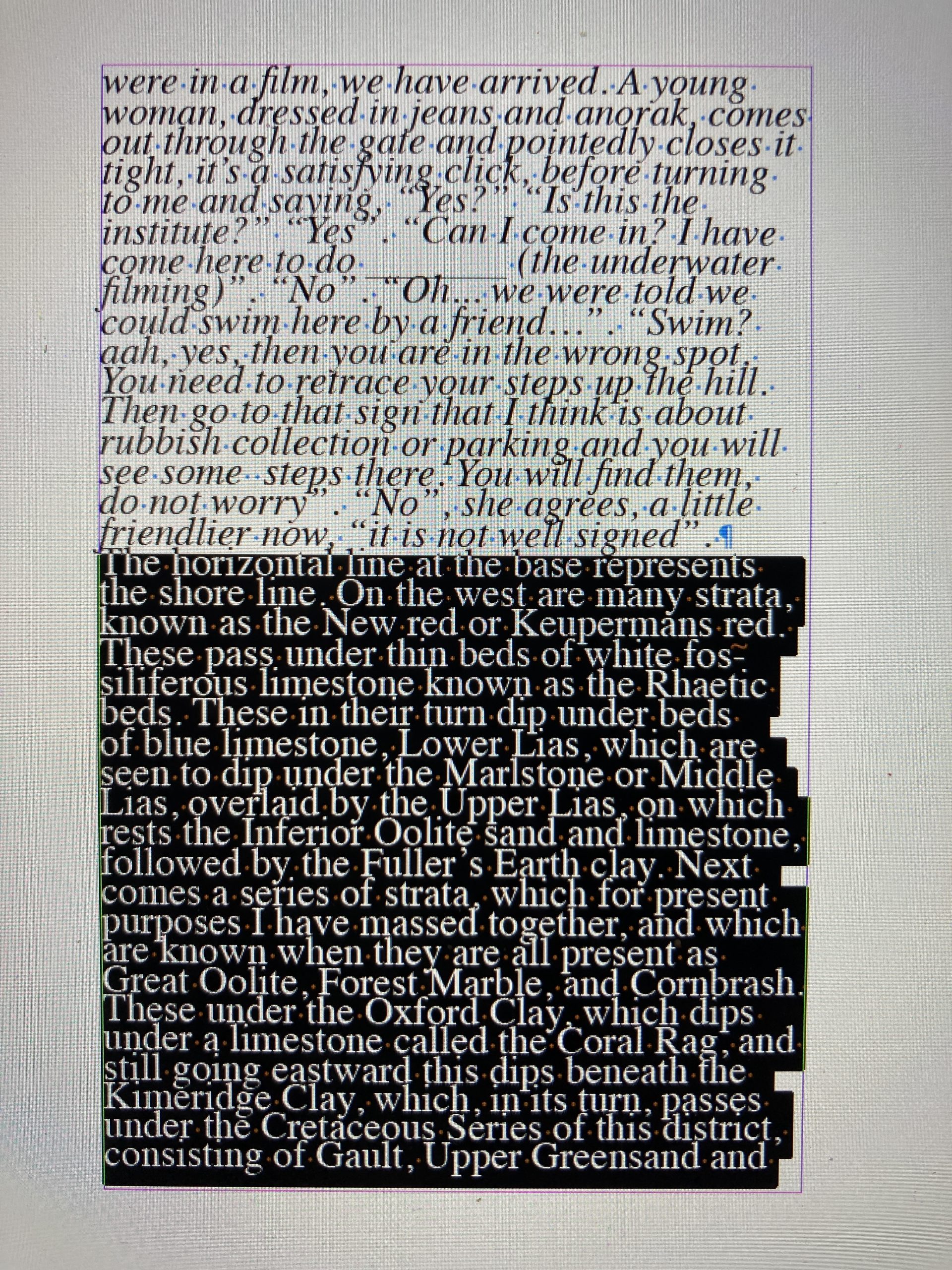 A piece of writing which was inspired by a guide book to Walks in Somerset found in a youth hostel’s cupboard, bought in a local auction. I started writing a diary whilst on the KURS Artists and Writers Residency in Split, 2017. The initial material has become a piece of writing about intermittent and intense anxiety, when the intention was to document a series of walks and swims in the Marjan Park Forest of Split, a spectacular limestone landscape famous for its quarries. The writing is fragmentary and chopped up, trying to represent a state of mind. The pieces of writing are treated like fossils, or as layers in the strata of sedimentary rock, sentences as conglomerates of words. They are literally sandwiched into lines of text taken from a C19th book about Geology, which in pedantic detail tours Great Britain’s underlying rock formations, including the shelly limestone of Portland and the yellow sandstone of Burton Bradstock. 5 years have passed, there have been many interruptions in the timeline.